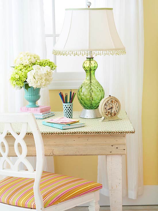 Tienes una mesa vieja a la que te gustaría dar un aire nuevo.¡Tapízala! Elige una tela que te guste y pégala o grápala a la mesa.