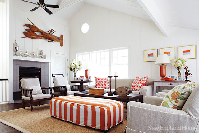 Casa de playa en la costa de New Hampshire-- en tonos marrones y naranjas, aunque no son los colores asociados habitualmente a las casas de playa, el resultado es cálido, acogedor y sereno.